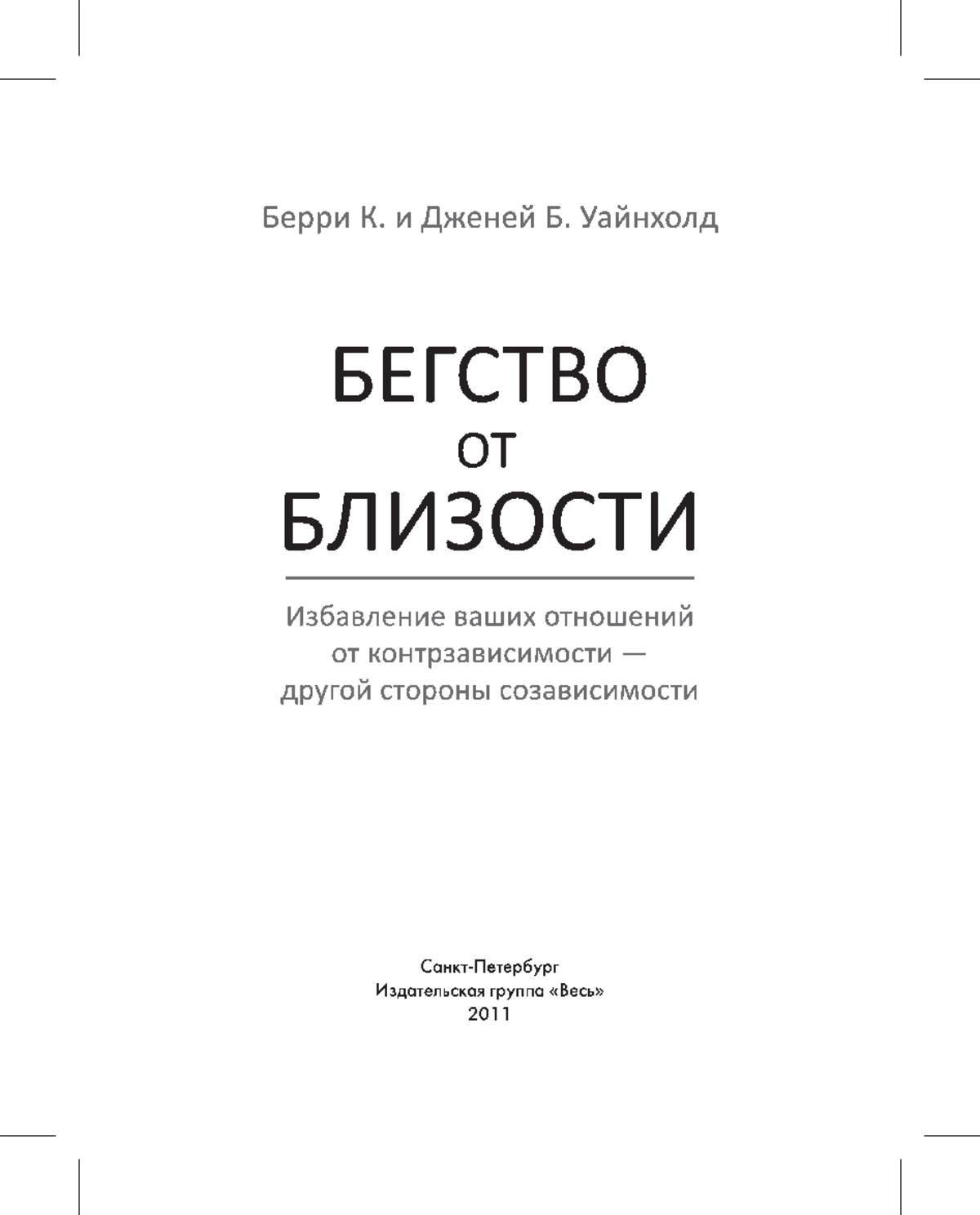 Уайнхолд Б. К., Уайнхолд Дж. Б. Бегство от близости. Избавление ваших отношений от контрависимости — другой стороны созависимости. — СПб.: ИГ «Весь», 2011. — 528 с. — (Помоги себе сам).