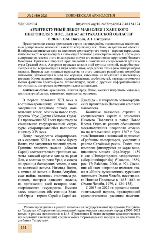 Статья: АРХИТЕКТУРНЫЙ ДЕКОР МАВЗОЛЕЯ 1 ХАНСКОГО НЕКРОПОЛЯ У ПОС. ЛАПАС АСТРАХАНСКОЙ ОБЛАСТИ