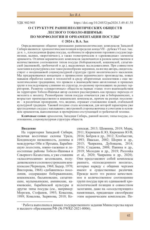 Статья: О СТРУКТУРЕ РАННЕНЕОЛИТИЧЕСКИХ ОБЩЕСТВ ЛЕСНОГО ТОБОЛО-ИШИМЬЯ: ПО МОРФОЛОГИИ И ОРНАМЕНТАЦИИ ПОСУДЫ