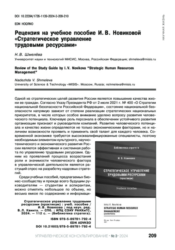 Статья: РЕЦЕНЗИЯ НА УЧЕБНОЕ ПОСОБИЕ И. В. НОВИКОВОЙ "СТРАТЕГИЧЕСКОЕ УПРАВЛЕНИЕ ТРУДОВЫМИ РЕСУРСАМИ"