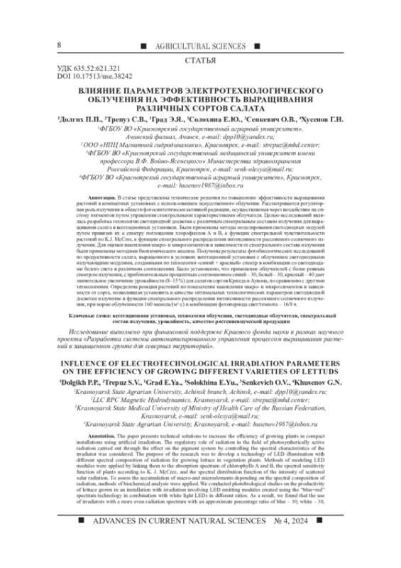Статья: ВЛИЯНИЕ ПАРАМЕТРОВ ЭЛЕКТРОТЕХНОЛОГИЧЕСКОГО ОБЛУЧЕНИЯ НА ЭФФЕКТИВНОСТЬ ВЫРАЩИВАНИЯ РАЗЛИЧНЫХ СОРТОВ САЛАТА