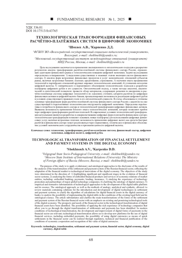 Цель исследования заключается в применении эволюционного и онтологического подходов к раскрытию результатов анализа трансформации расчётно-платёжной системы финансового сектора России, отражающих адаптацию финансового рынка к технологическим новациям цифровой экономики. Задачи исследования определились в направлении: 1) выделения существенных и знаковых этапов эволюции систем финансового сектора; 2) анализа форм встроенных финансовых продуктов и услуг экономических отношений субъектов рынка, включая: встроенные банкинг; платежи; кредитование; страхование; 3) изучения опыта продвижения технологий и партнёрских отношений крупных мировых технологических компаний; 4) уточнения онтологии цифровой валюты; 5) эмпирического и нормативного обоснования технологических подходов к разработке платформы цифрового рубля и его сущности. Онтологический подход, а также методы аналогии, аналитический и синтетический позволили: провести обзор материалов, содержащих решения по внедрению в расчётно-платёжные системы цифровых технологий и их освоению; уточнить алгоритм расчётов по цифровым финансовым активам в цифровой валюте банков; проанализировать возможность реализации цифрового рубля в условиях существующего правового поля и его онтологической сущности. В статье обоснованы и уточнены основные трансформации форм расчётно-платёжной системы финансового сектора России с акцентом на уже существующий и перспективные технологические инструменты цифровой экономики. Определены перспективы и потребности финансового сектора в технологической трансформации цифровых финансовых активов. Выявлена возможность применения богатого опыта технологических компаний, которые позволяют пройти через цифровую трансформацию расчётов и платежей. В современных условиях технологической трансформации актуальными являются разработка и совершенствование цифровых форм платежей в финансовом секторе; технологическая трансформация позволяет осваивать новые платформы для использования цифровых финансовых услуг, включая встроенные платежи; возможность применения цифровых валют как средств быстрых расчётов в финансовом секторе может реализоваться через нормативное, техническое и финансовое обоснование условий экономического сотрудничества и признания ценности цифровой валюты.