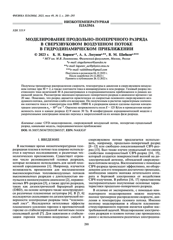 Статья: МОДЕЛИРОВАНИЕ ПРОДОЛЬНО-ПОПЕРЕЧНОГО РАЗРЯДА В СВЕРХЗВУКОВОМ ВОЗДУШНОМ ПОТОКЕ В ГИДРОДИНАМИЧЕСКОМ ПРИБЛИЖЕНИИ