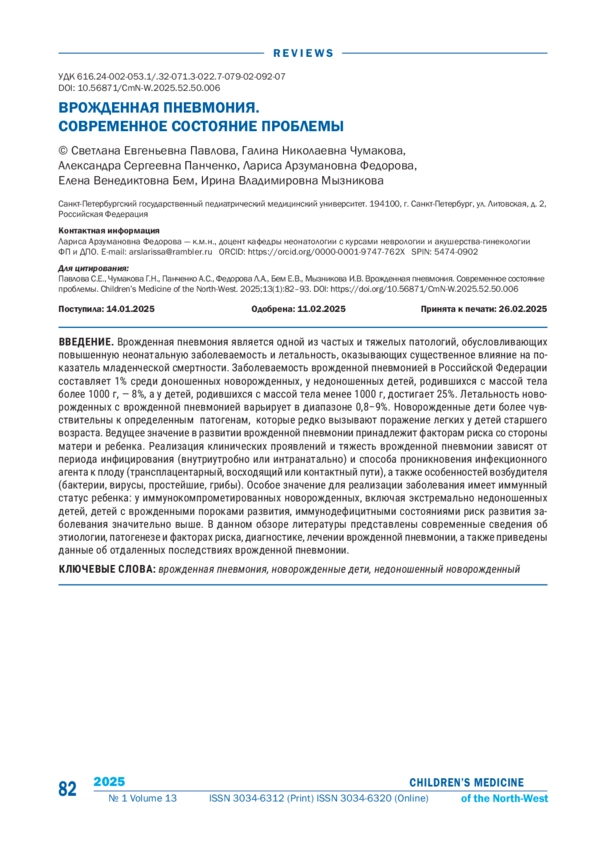 Врожденная пневмония является одной из частых и тяжелых патологий, обусловливающих повышенную неонатальную заболеваемость и летальность, оказывающих существенное влияние на показатель младенческой смертности. Заболеваемость врожденной пневмонией в Российской Федерации составляет 1% среди доношенных новорожденных, у недоношенных детей, родившихся с массой тела более 1000 г, — 8%, а у детей, родившихся с массой тела менее 1000 г, достигает 25%. Летальность новорожденных с врожденной пневмонией варьирует в диапазоне 0,8–9%. Новорожденные дети более чувствительны к определенным патогенам, которые редко вызывают поражение легких у детей старшего возраста. Ведущее значение в развитии врожденной пневмонии принадлежит факторам риска со стороны матери и ребенка. Реализация клинических проявлений и тяжесть врожденной пневмонии зависят от периода инфицирования (внутриутробно или интранатально) и способа проникновения инфекционного агента к плоду (трансплацентарный, восходящий или контактный пути), а также особенностей возбудителя (бактерии, вирусы, простейшие, грибы). Особое значение для реализации заболевания имеет иммунный статус ребенка: у иммунокомпрометированных новорожденных, включая экстремально недоношенных детей, детей с врожденными пороками развития, иммунодефицитными состояниями риск развития заболевания значительно выше. В данном обзоре литературы представлены современные сведения об этиологии, патогенезе и факторах риска, диагностике, лечении врожденной пневмонии, а также приведены данные об отдаленных последствиях врожденной пневмонии.