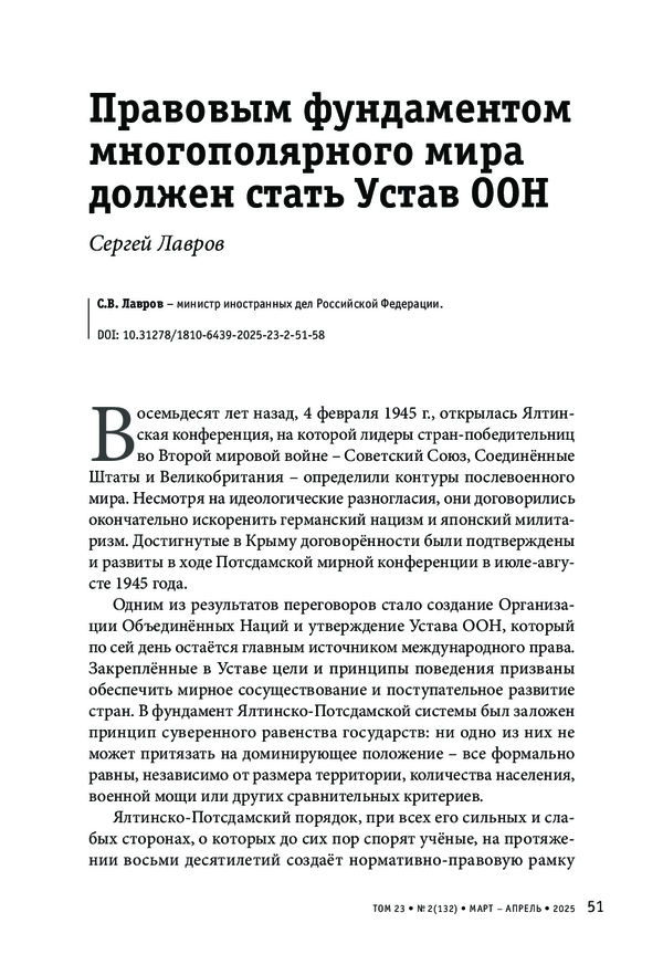 Восемьдесят лет назад, 4 февраля 1945 г., открылась Ялтинская конференция, на которой лидеры стран-победительниц во Второй мировой войне – Советский Союз, Соединённые Штаты и Великобритания – определили контуры послевоенного мира. Несмотря на идеологические разногласия, они договорились окончательно искоренить германский нацизм и японский милитаризм. Достигнутые в Крыму договорённости были подтверждены и развиты в ходе Потсдамской мирной конференции в июле-августе 1945 года.