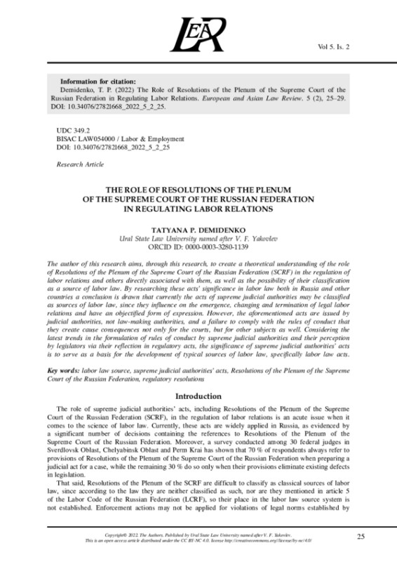 Статья: THE ROLE OF RESOLUTIONS OF THE PLENUM OF THE SUPREME COURT OF THE RUSSIAN FEDERATION IN REGULATING LABOR RELATIONS