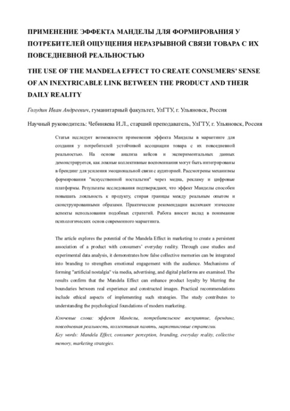 Статья исследует возможности применения эффекта Манделы в маркетинге для создания у потребителей устойчивой ассоциации товара с их повседневной реальностью. На основе анализа кейсов и экспериментальных данных демонстрируется, как ложные коллективные воспоминания могут быть интегрированы в брендинг для усиления эмоциональной связи с аудиторией. Рассмотрены механизмы формирования “искусственной ностальгии” через медиа, рекламу и цифровые платформы.