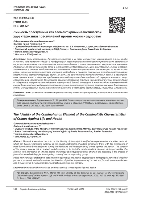 Статья: ЛИЧНОСТЬ ПРЕСТУПНИКА КАК ЭЛЕМЕНТ КРИМИНАЛИСТИЧЕСКОЙ ХАРАКТЕРИСТИКИ ПРЕСТУПЛЕНИЙ ПРОТИВ ЖИЗНИ И ЗДОРОВЬЯ