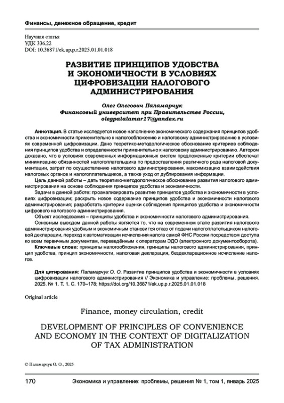 Статья: РАЗВИТИЕ ПРИНЦИПОВ УДОБСТВА И ЭКОНОМИЧНОСТИ В УСЛОВИЯХ ЦИФРОВИЗАЦИИ НАЛОГОВОГО АДМИНИСТРИРОВАНИЯ