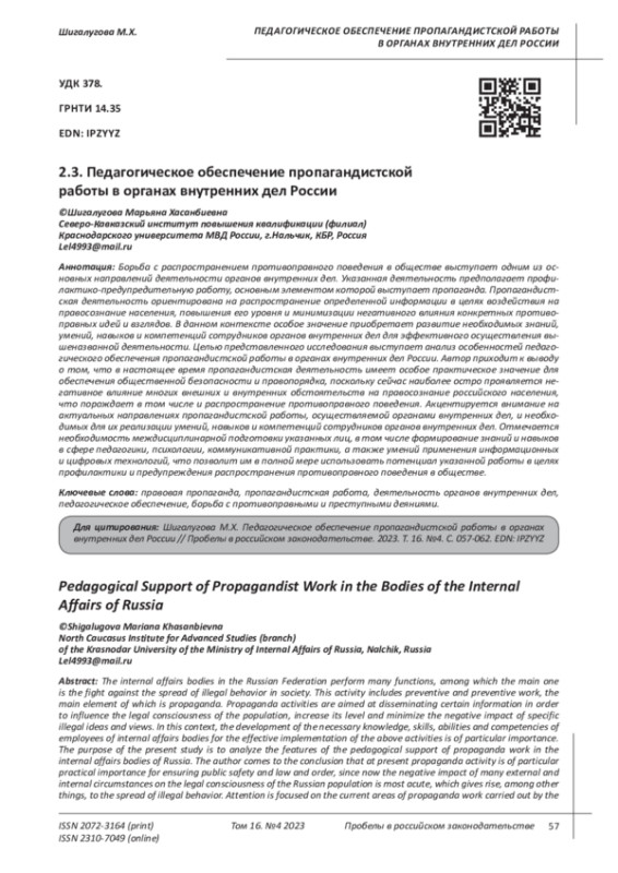 Борьба с распространением противоправного поведения в обществе выступает одним из основных направлений деятельности органов внутренних дел. Указанная деятельность предполагает профилактико-предупредительную работу, основным элементом которой выступает пропаганда. Пропагандистская деятельность ориентирована на распространение определенной информации в целях воздействия на правосознание населения, повышения его уровня и минимизации негативного влияния конкретных противоправных идей и взглядов. В данном контексте особое значение приобретает развитие необходимых знаний, умений, навыков и компетенций сотрудников органов внутренних дел для эффективного осуществления вышеназванной деятельности. Целью представленного исследования выступает анализ особенностей педагогического обеспечения пропагандистской работы в органах внутренних дел России. Автор приходит к выводу о том, что в настоящее время пропагандистская деятельность имеет особое практическое значение для обеспечения общественной безопасности и правопорядка, поскольку сейчас наиболее остро проявляется негативное влияние многих внешних и внутренних обстоятельств на правосознание российского населения, что порождает в том числе и распространение противоправного поведения. Акцентируется внимание на актуальных направлениях пропагандистской работы, осуществляемой органами внутренних дел, и необходимых для их реализации умений, навыков и компетенций сотрудников органов внутренних дел. Отмечается необходимость междисциплинарной подготовки указанных лиц, в том числе формирование знаний и навыков в сфере педагогики, психологии, коммуникативной практики, а также умений применения информационных и цифровых технологий, что позволит им в полной мере использовать потенциал указанной работы в целях профилактики и предупреждения распространения противоправного поведения в обществе.