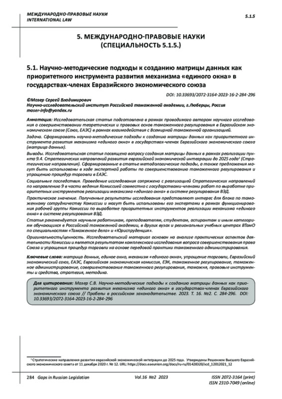 Статья: НАУЧНО-МЕТОДИЧЕСКИЕ ПОДХОДЫ К СОЗДАНИЮ МАТРИЦЫ ДАННЫХ КАК ПРИОРИТЕТНОГО ИНСТРУМЕНТА РАЗВИТИЯ МЕХАНИЗМА "ЕДИНОГО ОКНА" В ГОСУДАРСТВАХ-ЧЛЕНАХ ЕВРАЗИЙСКОГО ЭКОНОМИЧЕСКОГО СОЮЗА