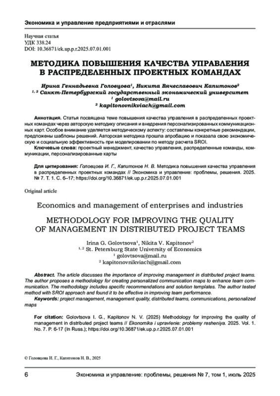 Статья: МЕТОДИКА ПОВЫШЕНИЯ КАЧЕСТВА УПРАВЛЕНИЯ В РАСПРЕДЕЛЕННЫХ ПРОЕКТНЫХ КОМАНДАХ
