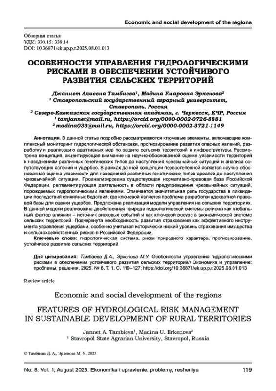 Статья: ОСОБЕННОСТИ УПРАВЛЕНИЯ ГИДРОЛОГИЧЕСКИМИ РИСКАМИ В ОБЕСПЕЧЕНИИ УСТОЙЧИВОГО РАЗВИТИЯ СЕЛЬСКИХ ТЕРРИТОРИЙ