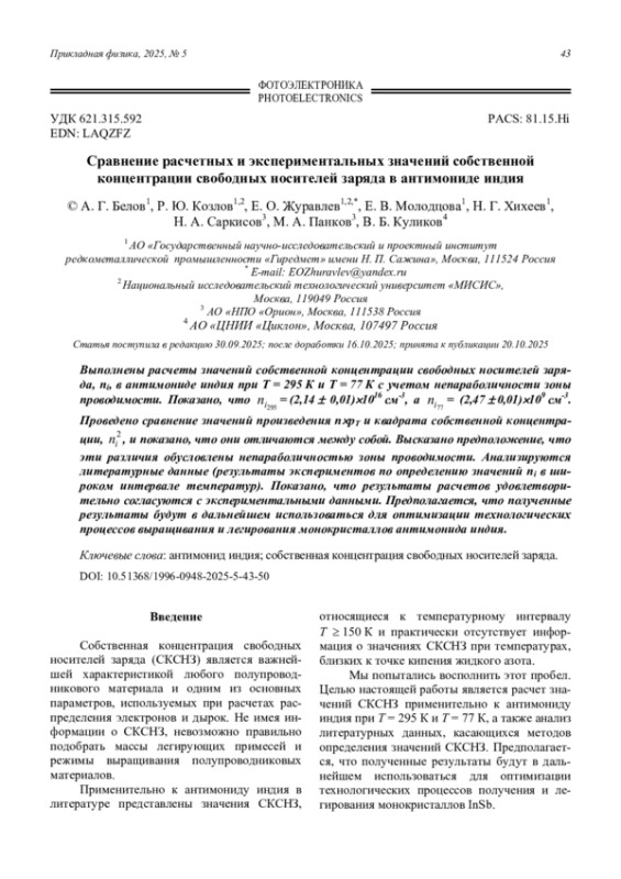Статья: Сравнение расчетных и экспериментальных значений собственной концентрации свободных носителей заряда в антимониде индия