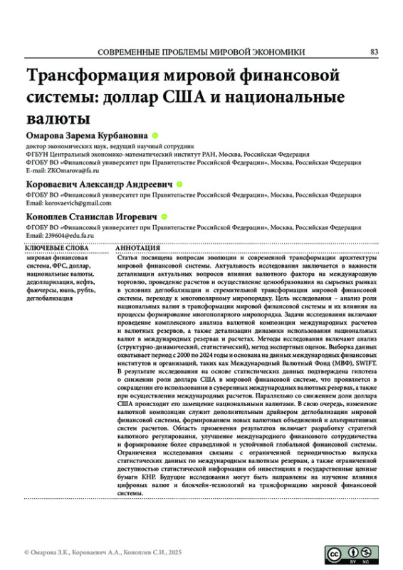 Статья посвящена вопросам эволюции и современной трансформации архитектуры мировой финансовой системы. Актуальность исследования заключается в важности детализации актуальных вопросов влияния валютного фактора на международную торговлю, проведение расчетов и осуществление ценообразования на сырьевых рынках в условиях деглобализации и стремительной трансформации мировой финансовой системы, переходу к многополярному миропорядку. Цель исследования - анализ роли национальных валют в трансформации мировой финансовой системы и их влияния на процессы формирование многополярного миропорядка. Задачи исследования включают проведение комплексного анализа валютной композиции международных расчетов и валютных резервов, а также детализации динамики использования национальных валют в международных резервах и расчетах. Методы исследования включают анализ (структурно-динамический, статистический), метод экспертных оценок. Выборка данных охватывает период с 2000 по 2024 годы и основана на данных международных финансовых институтов и организаций, таких как Международный Валютный Фонд (МВФ), SWIFT. В результате исследования на основе статистических данных подтверждена гипотеза о снижении роли доллара США в мировой финансовой системе, что проявляется в сокращении его использования в суверенных международных валютных резервах, а также при осуществлении международных расчетов. Параллельно со снижением доли доллара США происходит его замещение национальными валютами. В свою очередь, изменение валютной композиции служит дополнительным драйвером деглобализации мировой финансовой системы, формированием новых валютных объединений и альтернативных систем расчетов. Область применения результатов включает разработку стратегий валютного регулирования, улучшение международного финансового сотрудничества и формирование более справедливой и устойчивой глобальной финансовой системы. Ограничения исследования связаны с ограниченной периодичностью выпуска статистических данных по международным валютным резервам, а также ограниченной доступностью статистической информации об инвестициях в государственные ценные бумаги КНР. Будущие исследования могут быть направлены на изучение влияния цифровых валют и блокчейн-технологий на трансформацию мировой финансовой системы.