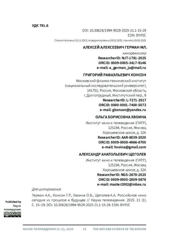 Публикация интервью сотрудников ГИТРа с известным режиссером Алексеем Германом-младшим связана с выявлением критериев успеха в современном кинотворчестве. Эта проблема раскрывается через рассмотрение многих вопросов: отношение к новому, в том числе к неизбежной интенсификации технологизации; осмысление разных киножанров, прежде всего фантастики, как маркера новаторства на экране; искусственный интеллект в сравнении с творчеством живых художников; наследие кинематографического прошлого и место отечественного кино в мировом масштабе; финансирование киноиндустрии в России и США. Изучая художественную практику современной киноиндустрии в сравнении с более ранними этапами ее эволюции, авторы делают попытку сформировать прогностический взгляд на развитие кинематографа, прежде всего, отечественного.