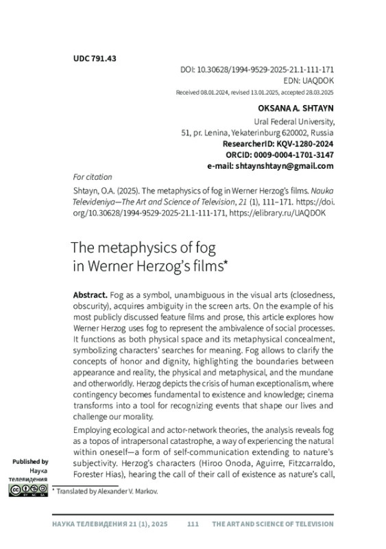 Туман как символ, однозначный в изобразительных искусствах (закрытость, неясность), приобретает неоднозначность в искусствах экранных. В статье на примере наиболее публично обсуждаемых художественных фильмов Вернера Херцога показано, что он осмысляет через этот образ амбивалентность социальных процессов. Туман выступает физическим пространством и его метафизическим сокрытием, символизируя поиск и обретение смысла героями произведений. Туман позволяет уточнить понятия чести и достоинства человека, проводя границу между видимостью и сущностью, физикой и метафизикой, потусторонним и здешним миром. Херцог показывает кризис человеческой исключительности, контингентность события становится фундаментальным свойством бытия и познания; кинематограф превращается в механизм признания событий, формирующих человека и ставящих мораль под вопрос. Методологической основой статьи стали современные построения экологических теорий и акторно-сетевой теории. Туман у Херцога - топос внутриличностной катастрофы, способ проживания природного в себе, автокоммуникация, распространенная и на природу с ее формами субъектности. Кинематографические и литературные герои Херцога - Хироо Онода, Агирре, Фицкарральдо, Лесник - слышат зов бытия как зов природы, возвращаются в ее лоно и необратимо утрачивают представления о чести. В фильмах Херцога туман как явление природы становится метафорой агрессивности и трансгрессии. Связать различные семантические решения Херцога, связанные с туманом, позволяет метод топологической рефлексии, рассматривающий психическую жизнь героев как карту их маршрутов, а топос тумана как единственный доступный познанию их актуальный психологический статус.