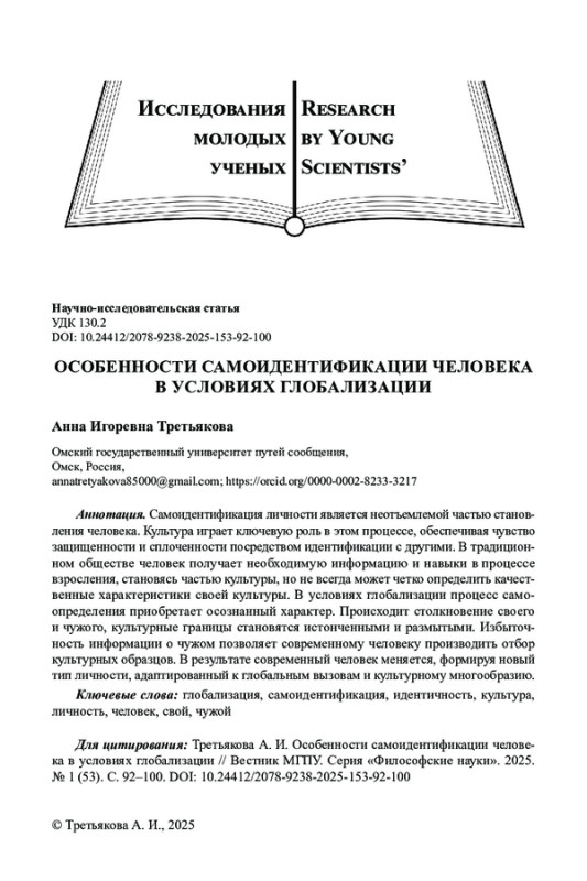 Статья: ОСОБЕННОСТИ САМОИДЕНТИФИКАЦИИ ЧЕЛОВЕКА В УСЛОВИЯХ ГЛОБАЛИЗАЦИИ