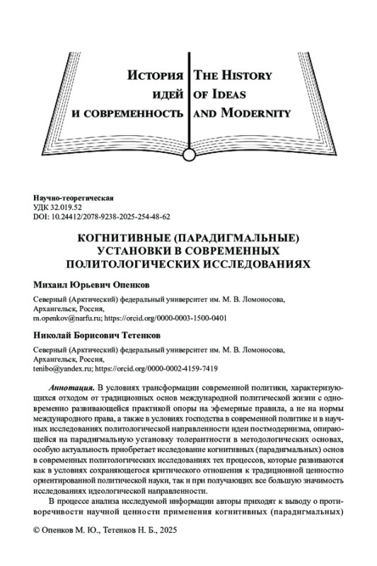 Статья: КОГНИТИВНЫЕ (ПАРАДИГМАЛЬНЫЕ) УСТАНОВКИ В СОВРЕМЕННЫХ ПОЛИТОЛОГИЧЕСКИХ ИССЛЕДОВАНИЯХ