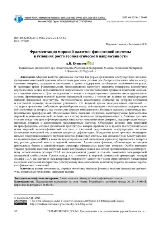 Статья: ФРАГМЕНТАЦИЯ МИРОВОЙ ВАЛЮТНО-ФИНАНСОВОЙ СИСТЕМЫ В УСЛОВИЯХ РОСТА ГЕОПОЛИТИЧЕСКОЙ НАПРЯЖЕННОСТИ