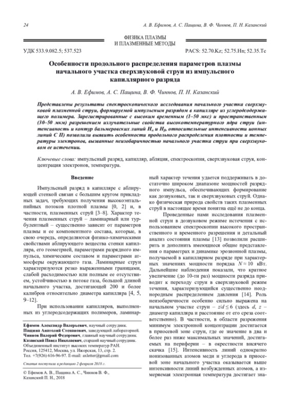 Статья: Особенности продольного распределения параметров плазмы начального участка сверхзвуковой струи из импульсного капиллярного разряда
