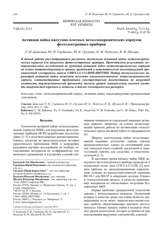 Статья: Активная пайка вакуумно-плотных металлокерамических корпусов фотоэлектронных приборов