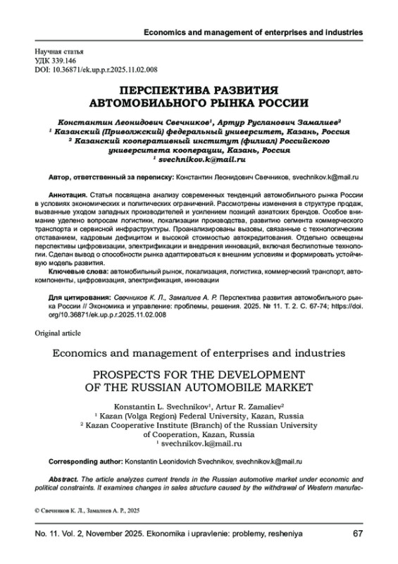 Статья посвящена анализу современных тенденций автомобильного рынка России в условиях экономических и политических ограничений. Рассмотрены изменения в структуре продаж, вызванные уходом западных производителей и усилением позиций азиатских брендов. Особое внимание уделено вопросам логистики, локализации производства, развитию сегмента коммерческого транспорта и сервисной инфраструктуры. Проанализированы вызовы, связанные с технологическим отставанием, кадровым дефицитом и высокой стоимостью автокредитования. Отдельно освещены перспективы цифровизации, электрификации и внедрения инноваций, включая беспилотные технологии. Сделан вывод о способности рынка адаптироваться к внешним условиям и формировать устойчивую модель развития.
