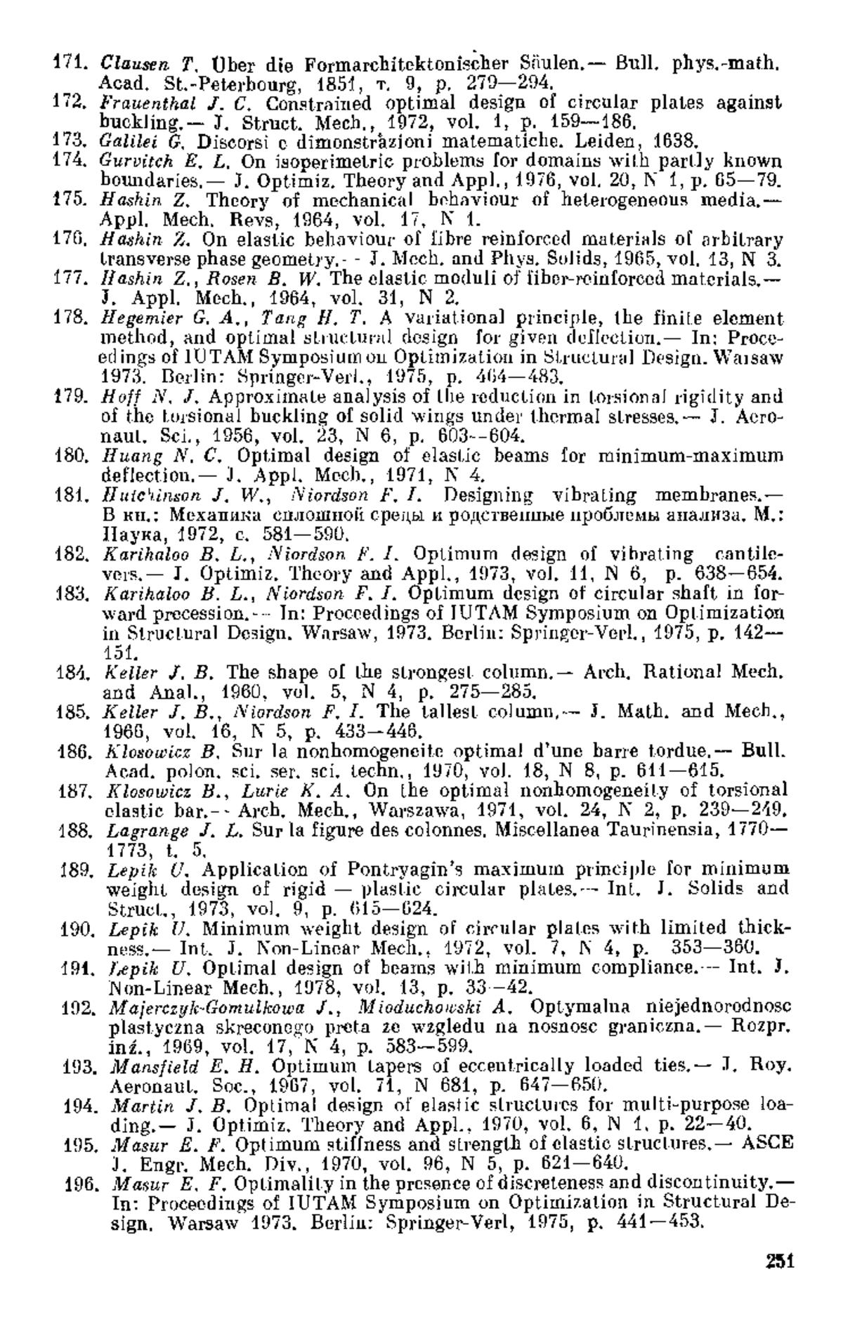 Бапичук Н.В. Оптимизация форм упругих тел. М.: Наука, 1980. Табл. 3, ил. 83, библиогр. 246 назв.; стр. 256.