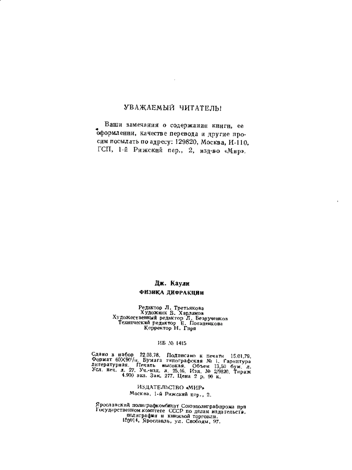 Книга проф. Дж. Каули, внесшего существенный вклад в развитие физической оптики, охватывает материал, относящийся к оптике рентгеновских лучей, электронов и нейтронов.