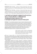 В статье рассматриваются мероприятия в рамках проведения II Международного буддийского форума в г. Улан-Удэ (Республика Бурятия) как события, целью которых является укрепление и сохранение традиционных духовно-нравственных ценностей. Вместе с тем авторы рассматривают, как через риторику сохранения традиционных ценностей и общность буддийской традиции укрепляются уже существующие международные контакты с государствами Азии и создаются новые гуманитарные соглашения, а также оценивают перспективы создания международного альянса, где общим фундаментом станет понимание необходимости сохранения и защиты традиционных ценностей.